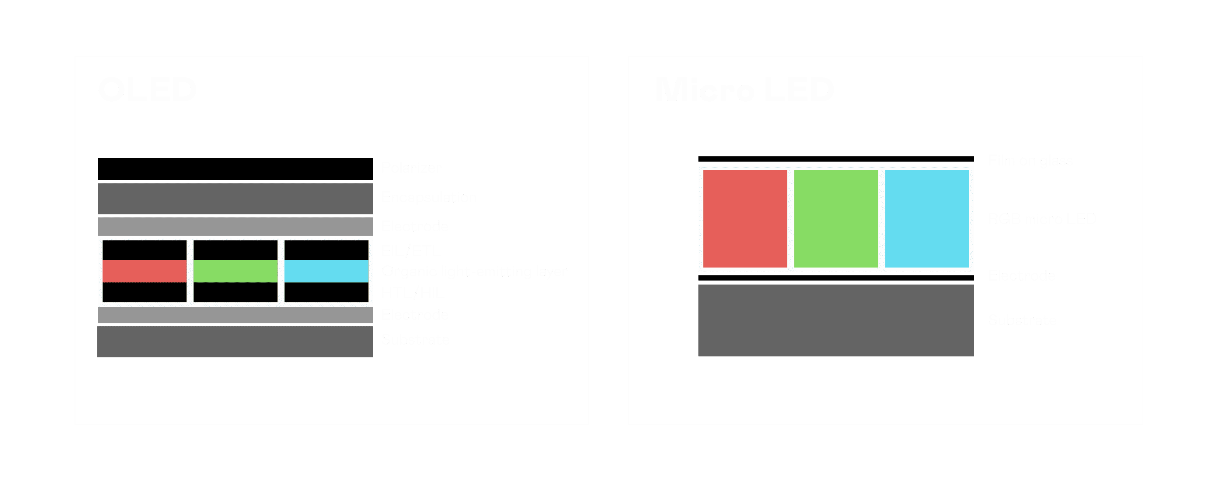以 LED 做为显示画素,,可让 LED 的发光效率发挥到极致,,从而让显示器具备优异的亮度表现,,,,不论是在户外或室内,,均具备出众的显示效果。。。。同时,,,,与使用有机材料的 OLED 相比,,LED 具备更稳定、、寿命更长的特性,,不仅不会有画面烙印问题,,,而且更不容易出现故障、、、、坏点。。。。